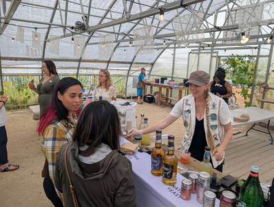 Throughout the evening, light bites kept the energy high. Carrot cake bites, gluten free pretzels, and colorful fruit skewers gave guests something to nibble between painting, sipping, and laughing. A bit of summer rain rolled in, but it did nothing to slow the evening. Instead, it added to the cozy, connected atmosphere of a late afternoon in our hoop house and teaching kitchen.